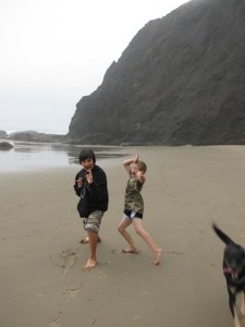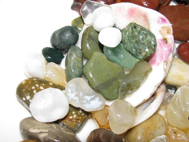 Come around to the “mystery” beach. Not sure why it’s a mystery, but it is hard to access. Only about an hour a day, twice a day, and not at all low tides. But we’ve been working on going back  – this week we did! It was SUPER cold and windy, the wind coming off the beach whipping the surf into thick whipping cream foam, the foam blowing around all over.  But the view is amazing! We sat on the beach for about a half an hour and found a zip lock baggie full of red/green/white and yellow agates.