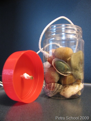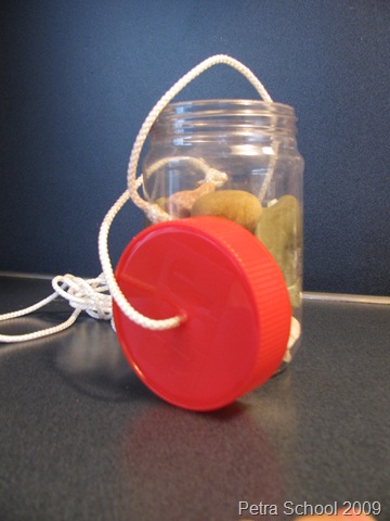 Each time we go to the beach, we find little tidbits to pick up. Agate, Petrified Wood, Shell, Rock, Driftwood etc. The trouble comes with where to put it? I have tried to choose one collection pocket, but I’m too dim to remember which is which. So I end up with sand in the cell phone, the camera, my keys and wallet. Sigh. For the past two months we have been collecting Peanut Butter Jars and Mayonnaise Jars. I’ve had ideas swirling in my brain of how to create the contraption, to not loose a lid, to hang around the shoulders, to have a good rope, to be hand held if needed. So far, I haven’t been successful in perfect design. THEN LAST NIGHT – I found a blog with an example of how to attach the lid. Oh. My. You might say. Solved world hunger? Well. No . . . but it if you saw or listened through hearing me explain my ideas, you’d probably get the same look that my hubby gets . . . . Sometimes the simple solution and I don’t really meet at first. So – thanks to Plum Pudding’s Site, I found the perfect solution to the lost lid! The boys and I created 3 of these last night.