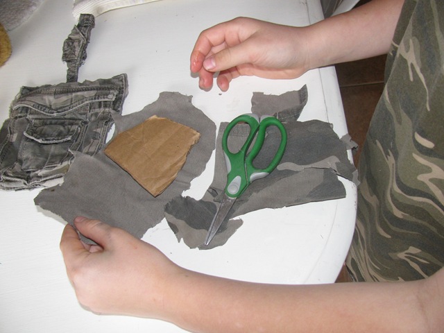 Homeschool Boys Craft CamoJon has grown attached to “Beary”. He reads him stories, and tucks him into his bed made from a shoe box at night. Yesterday he decided to make beary  pants.  Jon has a pair of shorts that had been patched 4 times and then still ripped up the leg.  We cut out all of the material we could salvage and hot glued some pants, then he designed a hat as well.  Jon likes to dress head to toe in camo. The colors have to match, black/blue/green/brown/forest – can not be mixed. He has 3 entire outfits. Here’s Beary’s.Homeschool Craft Boys Camo Bear