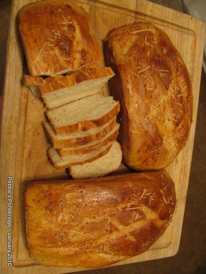 Tonight we tried the bread again – and it didn’t rise again. I added some yeast, water, oil and extra flour to the recipe and it finally doubled, almost tripled. We had to run in the afternoon to a coffee date with some friends, and then bible study at church, so the loaves ended up on the second rise for almost 6 hours. Still did fine. Crispy crust, soft sponge middles. Oh Yum. I sprinkled some cheese on the top before baking.