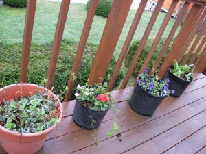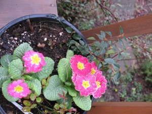 We planted some early flowers on the patio on February 14th to brighten the pots while we wait for the roses to re-grow. 🙂 The flowers in the yard are budding out, looks like we will have a wall of honeysuckle on the south side of the yard. LOVE spring on the coast!
