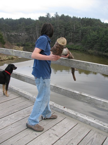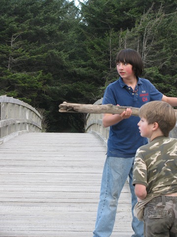 The boys spent an hour gathering logs, rocks, twigs, you name it. Throw the log over the bridge, then pelt it with rocks. Except – one large log got stuck in the piling underneath. So the object became to figure out how to dislodge it. We discovered that getting another flat piece of driftwood stuck created a current that made the first stuck log move. Pelt it with large stones, and tah dah.