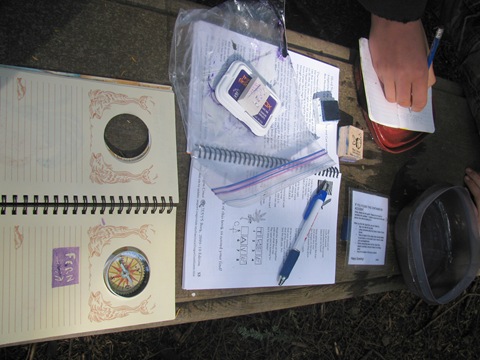 The boys immediately loved the clues, when they were read in context to where we were walking and what we were seeing – racing along ahead on the trail – and then needing to stop for more clues.  We should have checked on line to see that the Owl was missing  . . .a clue in both Quests today – but we found the Quest Box with a bit of sleuthing, then had fun sitting on a bench and filling out the guestbook letterboxing style.