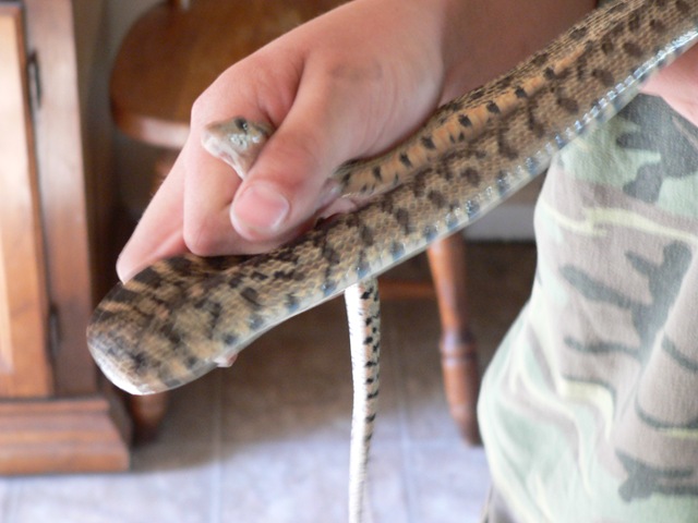 This one is a Gopher Snake, found in the United States in Oregon in the High Desert. It is really sandy, no/little water, and eats the field mice/varmits. We were not around him enough to see if he’d like to wrap around an arm, this one was older, full grown, at least 6 feet long. If raised from a younger time, might make a nice pet, as it is non venimous – and rats/mice would be easy enough to get.