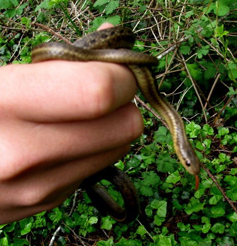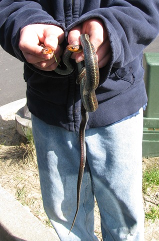 The boys have come across several snakes this spring – 2 very large Red-Sided Western Garter Snakes near a pond that drains to the Pacific Ocean.