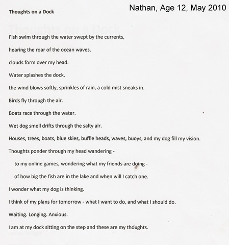 The advice – to pick a landscape, topic, event – and make a list of what you See, Hear, Smell, Taste, Touch, Feelings, and Thoughts.  I nervously sat down with the boys to talk about our new addition to our Nature Journals.  I always have a catch in my confidence when bringing topics that I am interested in, and they have not asked about. I never can know if their interest will be sparked.  Nathan says – Oh – You mean like –  Silently swims the fish just out of reach of my line. . . bla bla bla –0r – Walking through a meadow, gazing at the wild, seeing it spring into color, bla bla bla, and he did this about 4 times with 5-6 line poems before I could even take a breath.  YES!  I mean, ya, ya something like that is what I had in mind.  Lets um, write one of those little ditties down.  Do you often think in these flowing terms when you are lost in thought? – Then he got nervous.  Exposed. Insecure. I had pounced on my joy too loudly, too quickly.