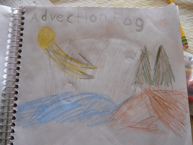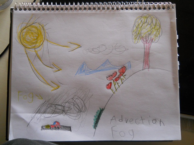 Awesome. We have been doing the same thing not with fog but afternoon thundercloud build up over the Sierras. Every afternoon the clouds get taller and taller and bigger and bigger. We pretty much did the same sorts of diagrams you did but instead of the ocean, we used the Sacramento Valley and the Sierra Nevadas to explain how and why we get clouds.