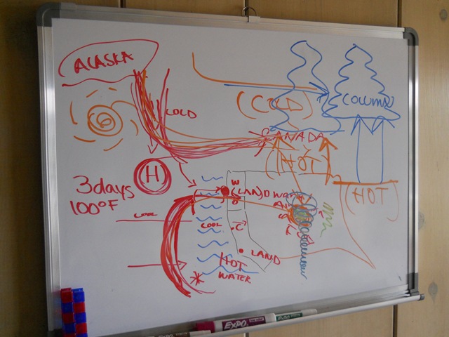 We were informed on the TV that we would receive unseasonably warm weather for 3-4 days, topping 100 degrees as a high pressure system sat on the coast, forcing the northern cooler air to go through Canada – and allowing the system of warm HOT air from the south to travel north and move on shore in Oregon.