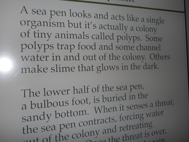Aqarium Text Sea PenOur โ€œLearningโ€ activity involved the Sea Pen.  โ€œA sea pen looks and acts like a single organism but itโ€™s acutally a colony of tiny animals called polyps. Some polyps trap food and some channel water in and out of the colony. Others make slime that glows in the dark. The lower half of the sea pen, a bulbous foot, is buried in the sandy bottom. When it senses a threat, the sea pen contracts, forcing water out of the colony and retreating into the sand until the threat is over.โ€