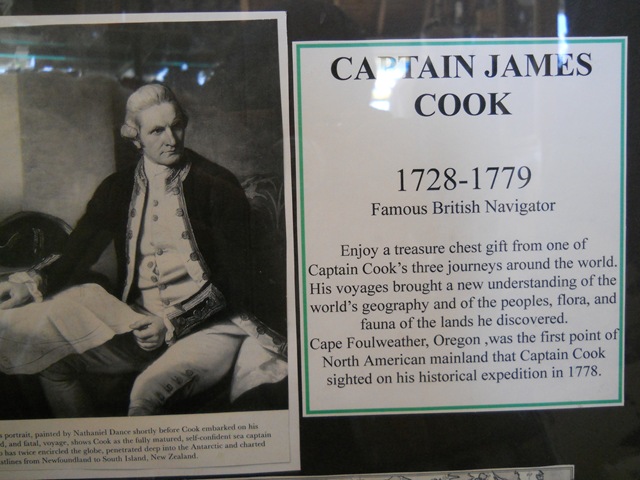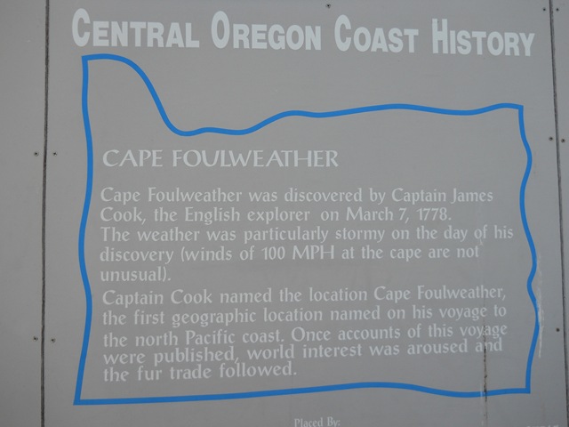 DSCN2556After a picnic under a shore pine โ€“ we meandered up the coast and stopped at the Cape Foulweather Lookout.  โ€œCape Foulweather was discovered by Captain James Cook, the English explorer on March 7, 1778. The weather was particulary stormy on the day of his discovery (winds of 100  MPH at the cape are not unusual). Captain Cook named the location Cape Foulweather, the first geographic location named on his voyage to the north Pacific coast. Once accounts of this voyage were published, world interest was aroused and the fur trade followed.โ€