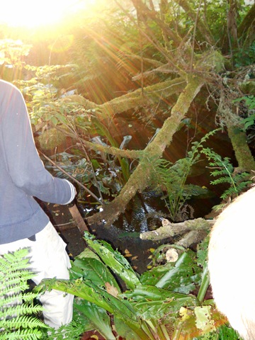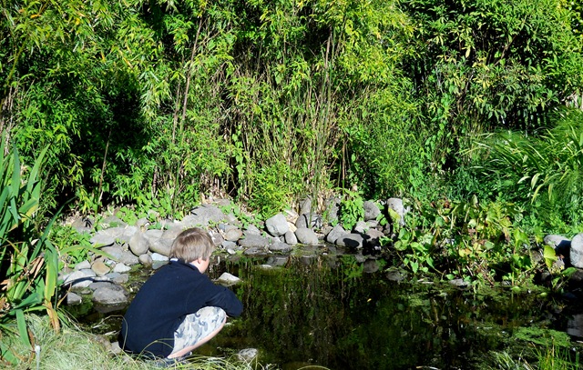 A lot of plant life the ponds, but little animal evidence, A LARGE shore pine forest, a natural jungle gym, interesting flowers, bamboo, and the closest thing that looked like a frog in the reflection of the pond.