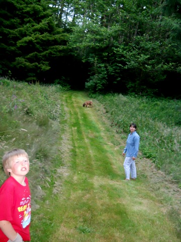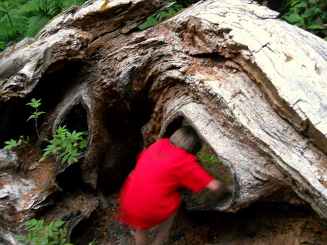 I asked the boys what they learned from all of this, on the fly while they walked by me typing, and Nate’s first response was that it was a waste of time – his goal was to find frogs. He said he had fun finding new places and liked the fun walks through the forests – and liked the new fact that the fish eat the frogs.  Jon said he liked the elk trail and tracks and the “treehouse” that our neighbor carved out of a trunk.