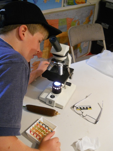 Oh the Joy! We have a Microscope now! Um. Except. We didn’t know that it came with several dozen pre-loaded slides – so we took quite a side tour of looking at tiny bits of creatures/plants/insects/textiles – and then back to the pistillate and staminate parts: