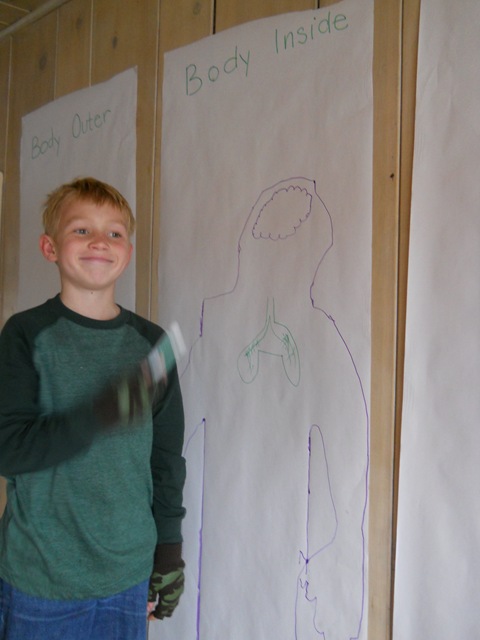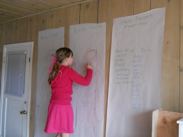 The kids drew bodies under the titles, Inside Body and Outside Body, then had a running list of Ideas in the third column. Their homework from last week was to come up with a body part that they would not want to stop working, break, need fixed, etc.