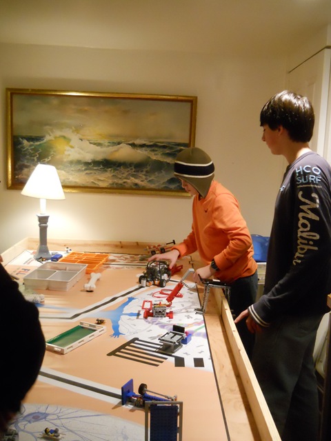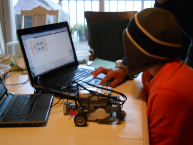 Yesterday we spent an hour on learning how to program the light sensor to have the robot follow a black line. We didn’t get the robot to move forward, but it did find the line and stay on it. I think if we had an extra half an hour or so to tweak the program – it would have worked. By we – I mean they. I had fun sipping coffee and listening. ‘We have a question’, they would ask. All the hours of research would help me to direct them to find their answer.