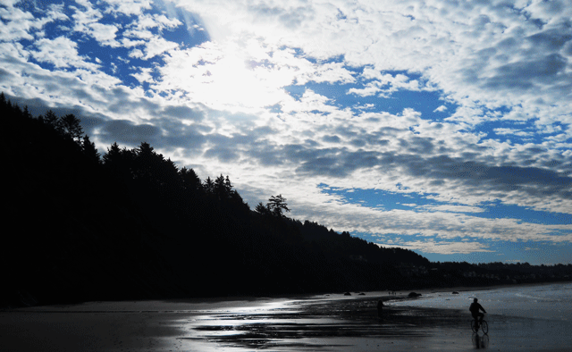 This is a beautiful shot – but also a potentially sad one. See the two bike riders? See the water line of where the waves have been? As you get out to Road’s End it is not wise to follow the water line of the ocean, but rather the water line to the east that you see on the beach. Question to yourself why that sand is so wet . . . . The end of Road’s End towards the mouth of the Salmon River on the other side pulls the water in several directions. The Surf will come in at unpredictable ways.