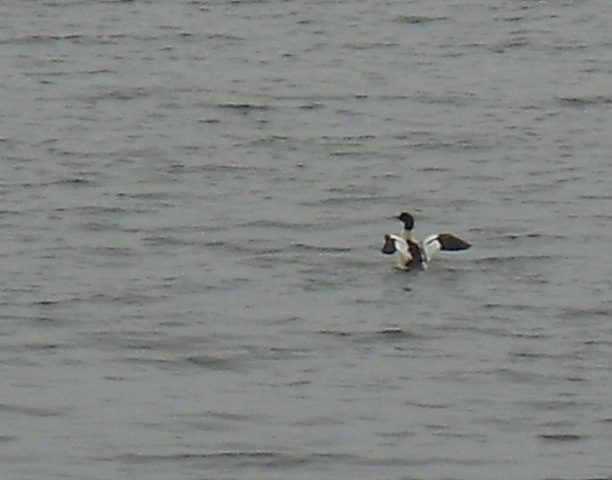 Snow. Male Merganser? He’s the only one if so. Canvas back?