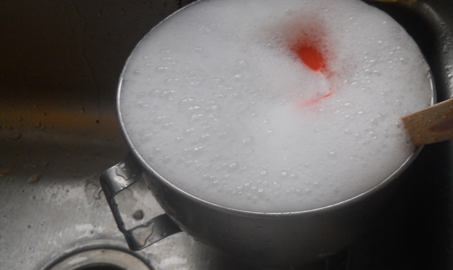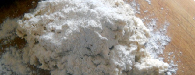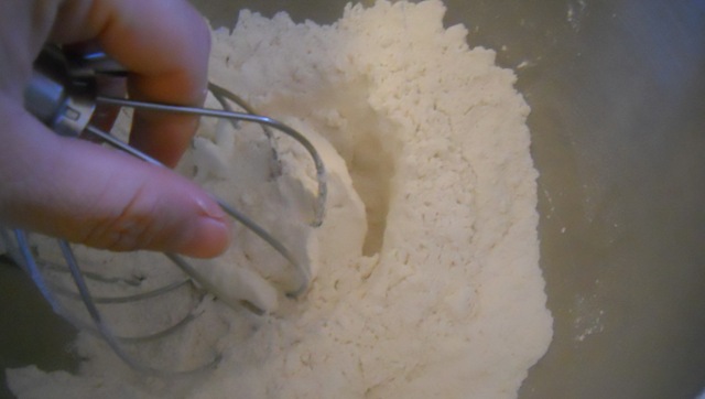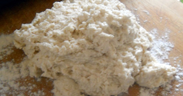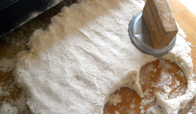 I do not have buttermilk in the fridge daily like my grandma did, nor do I have a goat tied to the back porch – so I used milk with a splash of vinegar. I let the milk and vinegar sit for a few minutes to curdle. I think it helps the reaction to the baking soda . . . . Be careful putting the whole cup in. I did today and the dough was a little moist. I like to add in 3/4 cup and then see dough form from there.