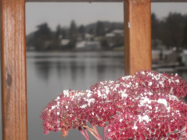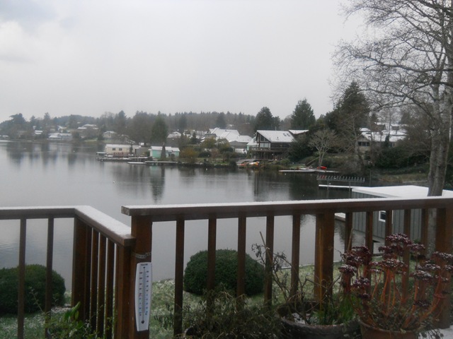 The last few days on the Central Oregon Coast have been C. O. L. D. Well. For us that is. It’s dropped past our comfortable 50’s into the 30’s for a couple of days. The precipitation has fallen softly, dusting white across the landscape. Snow might be a bit of a large word for the accumulation we enjoyed. I hear that further east they got a couple of inches, but here, a mile from the Ocean, close to the warm water of the lake – not so much. 🙂 The photo above was taken the morning of the “Big Snow” on Tuesday that closed the school down.