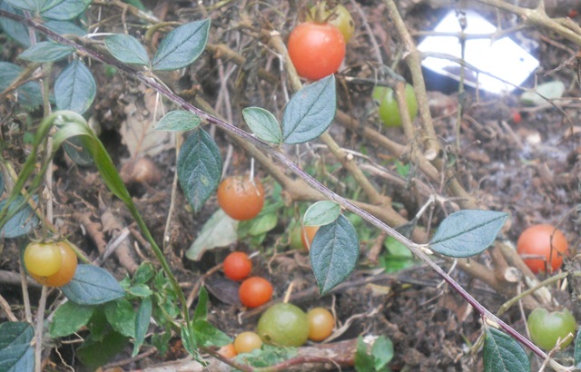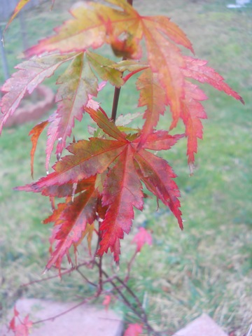 With noggin in tact – I’ll show you some color in the garden – The Roses re-bloomed. Several of them are full bud – and I think this last frost bid good bye to the tomatoes. The maples are turning beautifully – and the last shot is the “snow” on the hedges. 🙂