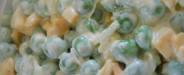 I couldn’t find my recipe for Pea Salad tonight – but I put in 1/4 cup mayo, 1/4 cup sour cream, salt, pepper, a half of a diced onion, bag of frozen peas, and a ton of diced cheddar cheese. Not quite 50/50 on peas to cheddar –but it should look close. I saved a piece of bacon from this morning that I will crumble into the salad tomorrow when I set it on the table.