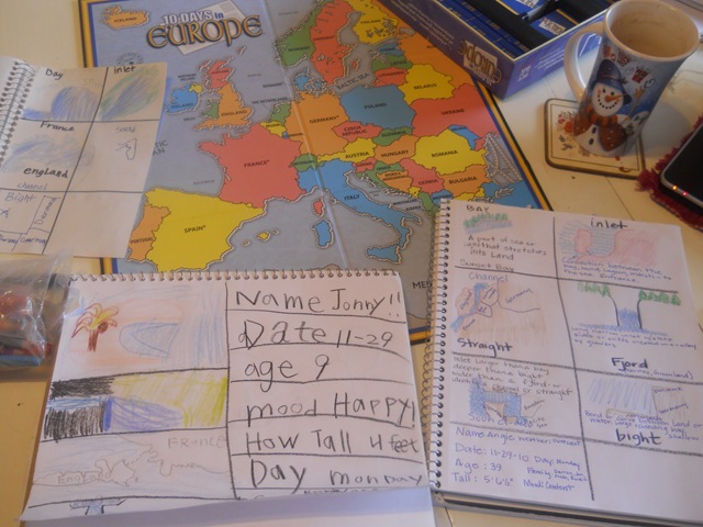 Today we started with 2 rounds of 10 Days in Europe.   This is a great game that helps you learn the European Countries – but it also helps to learn the water ways.  You can travel through the bridges, seas and oceans. We looked at the water inlets to guess what each would be called.