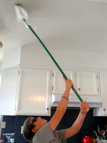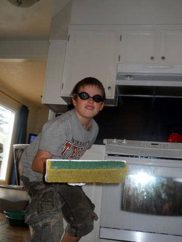 We spilled a cup of red juice.  Red dots to match up with the brown ones – combined with the coming of the Mimi from Austin – was a good excuse to clean it up.  Boy Style. 🙂