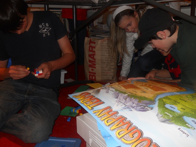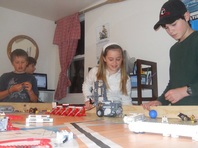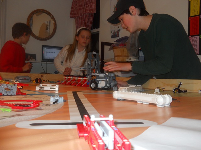 The kids went back to school for the day and then came to our house after school to program getting the robot to the brain this afternoon. It turned into a three hour practice – and they made it to the brain. (It took them an hour and a half to get to the Brain.) I keep mentioning the sensors that might make things easier, but they like the trial and error of the Go Until 600 Degrees, Turn 55 Degrees pattern. The older team mates lost the younger team mate’s joy of programming over the math of the 360 Degrees, but they had a great time hanging out under the table, and popping up to take turns plugging the Robot in to download the program. We had about 45 minutes of the whole team taking part on the questioning of how to get there, but once the nitty gritty of the blocks came in, you could see the programmers separate from the builders. They did figure out that they could create a My Block to pass between the first obstacle of bones, should they need to pass that way again, so far, they’ve just re-created the pass. I guess they had to do it enough times to figure out this tip learned early on was needed. 🙂 They’ll be here tonight to work on the actual missions on the Brain and Medicine Dispenser, but getting there seemed to be the hardest part! Poor Taco the Robot had quite the workout yesterday!
