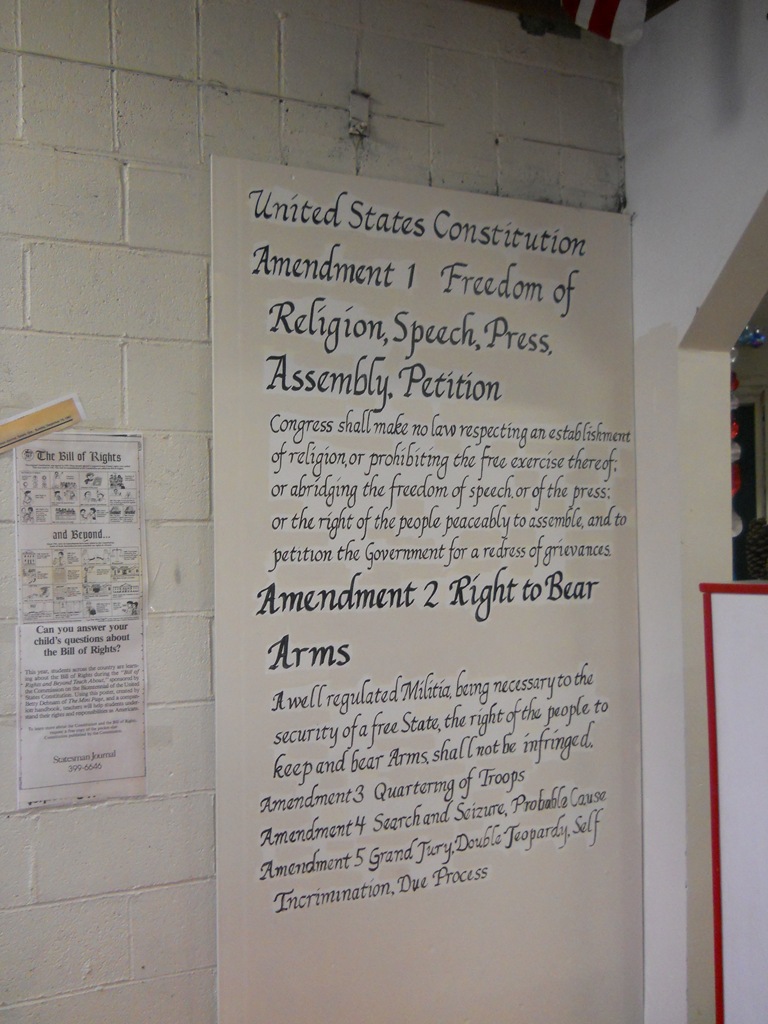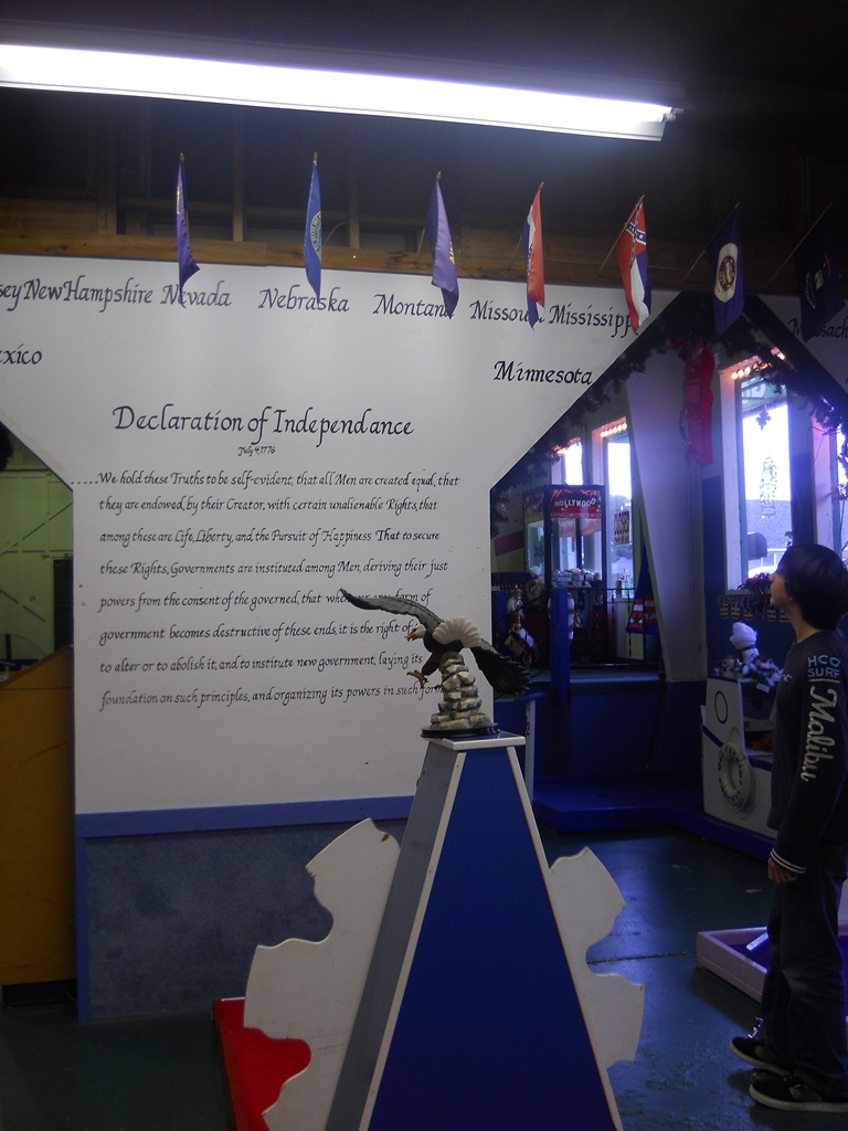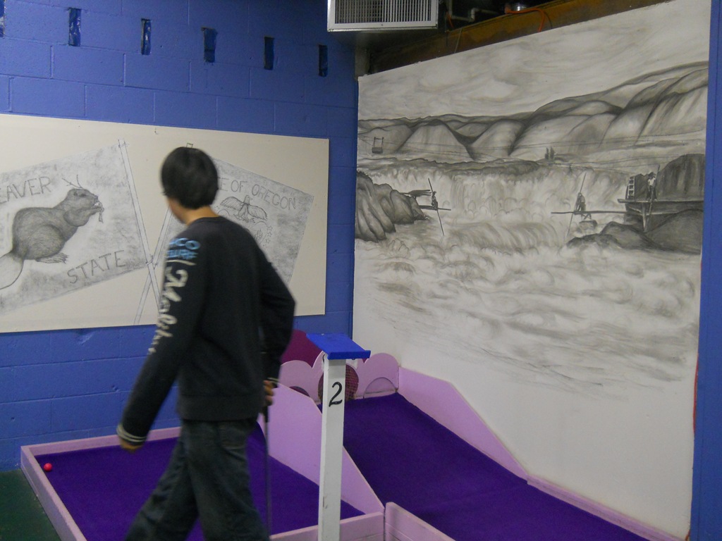 All-American Put-n-Bat Lincoln City Oregon I was expecting something tiny, cramped, old, dark etc.  I have seen a couple of pictures from a blurry cell phone of a birthday party. I had no idea how nice it would be. First of all – it is a homeschooler’s dream of a place. American History all over the place – they have spent their time in the details of maintaining the extremely well kept 17 holes, and have spent their creativity on the walls