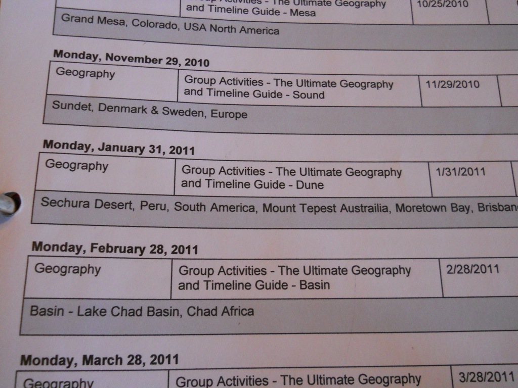 I looked at the items I had prepared in September to plan our Geography – It looks like for January our Geography Terms Tour will take us to the Dunes. The largest being the Sechura Desert in Peru or Mount Tepest in Austraila, or Moretown Bay in Brisbain. We’ll have to have a field trip to the beach of course. . . .