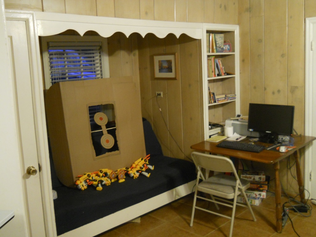 They moved the targets from the dining room down to the basement, hung sheets from the beds, put up the white board, and have been busy all afternoon.
