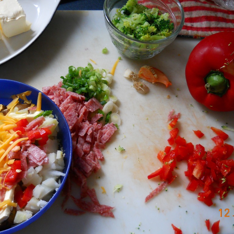 The boys took their Notebooking Page with them, I forgot colored pencils – so they are more grey scale. We came home and made Baked Potato Bar – which was colorful enough to share, since it was Winter Weds Color Edition. Smile