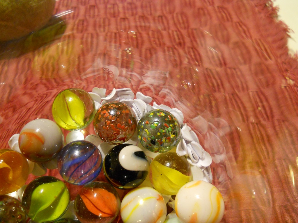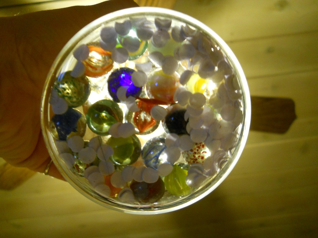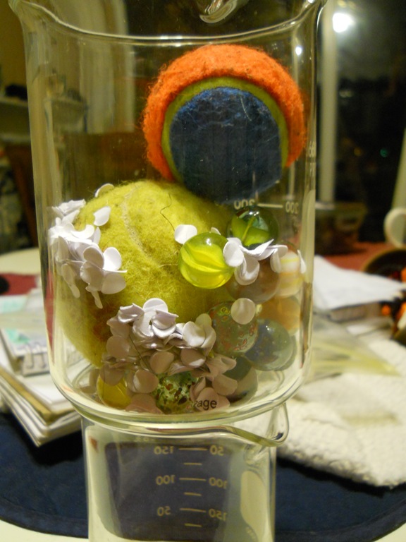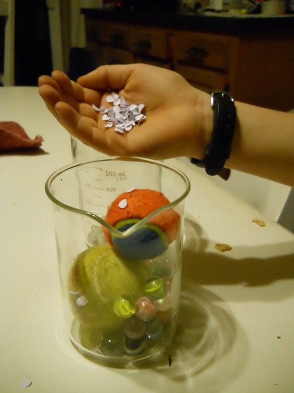 The Sand, or Tennis Balls went into the beaker first, then we poured in the marbles or Silt. These two items formed together quite nicely, – then – when we poured in the tiny flat layers of clay – the paper punches – the clay sort of layered – invaded – all of the open spaces. Those flat layers form together layer by layer.  A simple shake of the beaker, and the Silt and Clay would settle to the lowest available macropore space.