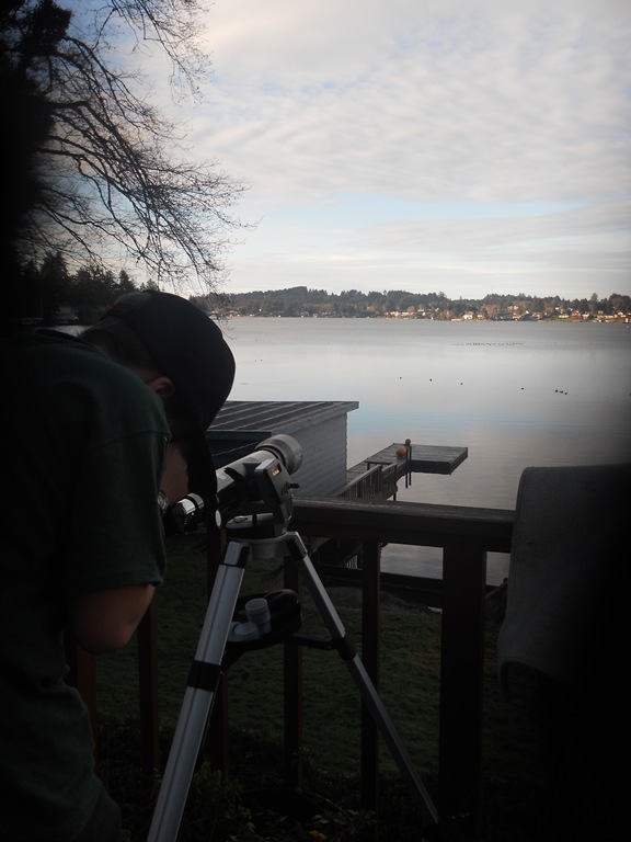 We received a Telescope as a gift this month – a friend bought it for his grand kids – and they didn’t have a use for it, and he thought of our boys. They had fun looking at Orion’s Belt this week. We had quite a few clear sky nights.  Here is the moon shining over the Red Alder Tree at about 3 a.m.  Not sure if this is what the Word meant when He said Joy comes in the Morning! But it was! See the little stars up there? Sa-weet. The boys got to see the pulsating star that is getting ready to split into twins.  Really Cool!