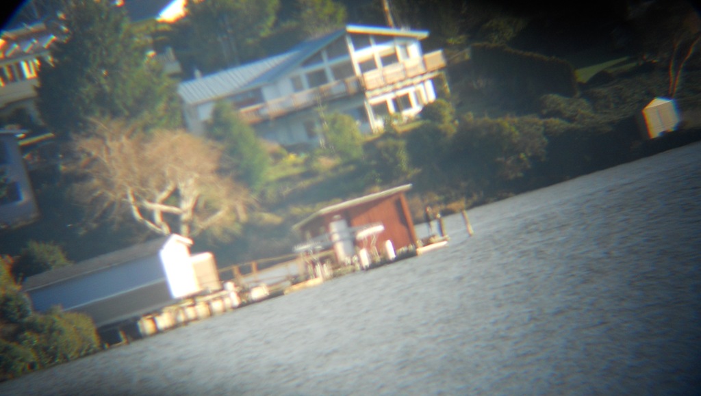 We could see all the way across the lake. These views were taken through the telescope lens, through the window – Those houses are at least 3/4 mile away. There is a guy fishing off of the dock of the brown boathouse.  Pretty cool.