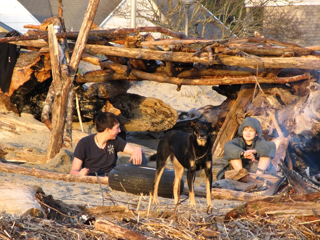 Jon likes creating forts and building fires. Today he and brother transported an abandoned fire over to our spot. They found some tongs and moved the large logs over, then got a flat piece of plywood and scooped the coals on it – and carried it over. We got a few raised eyebrows, but hey, since the beginning of time, man had to keep the coals lit –  The looks of fear turned into looks of admiration when the logs lit up in flame. Winking smile
