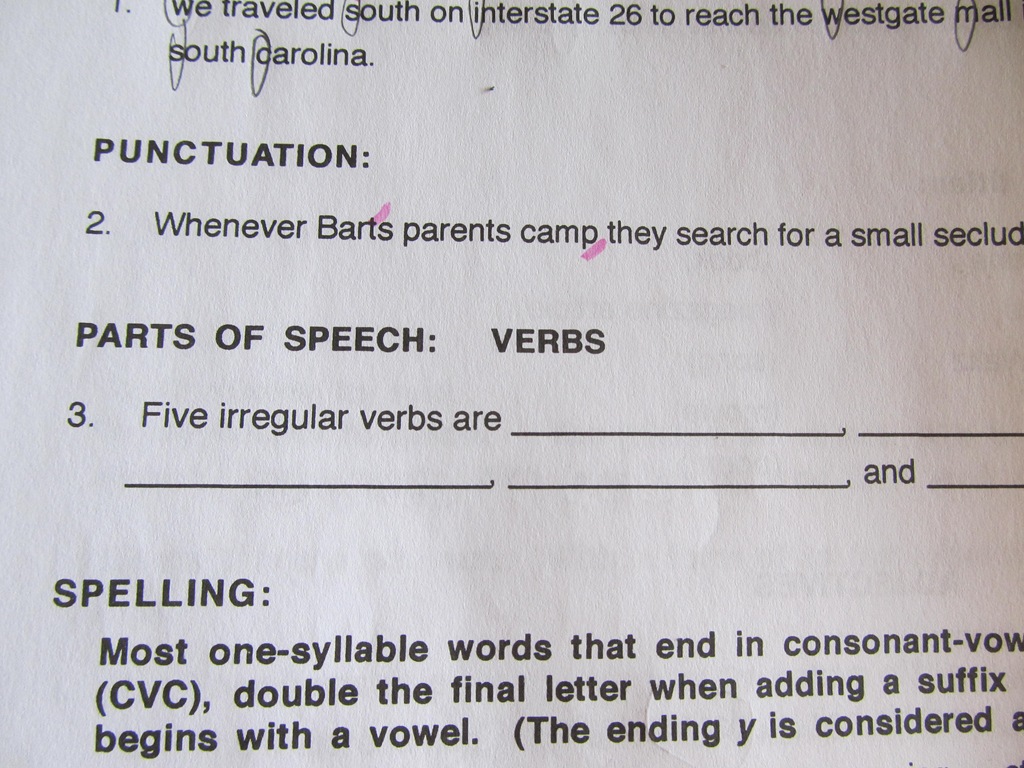 This happened yesterday – an example to give why the Daily Grams are worth the Daily Effort. We were swimming right along, when we came across a couple of comma issues up in the punctuation section, and in parts of speech, there was a question about irregular verbs. At first glance, neither Nate nor I could give an example of 5 irregular verbs. So we looked it up in one of our “helping books.”