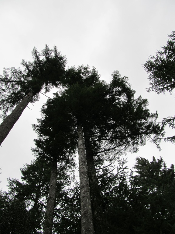 Suddenly, I saw three of the 3 pronged cones in one area. A few steps further and I saw 5 or 6.  Looking up all of the trees resembled each other. Looking straight ahead, I noticed a different form of trunk.