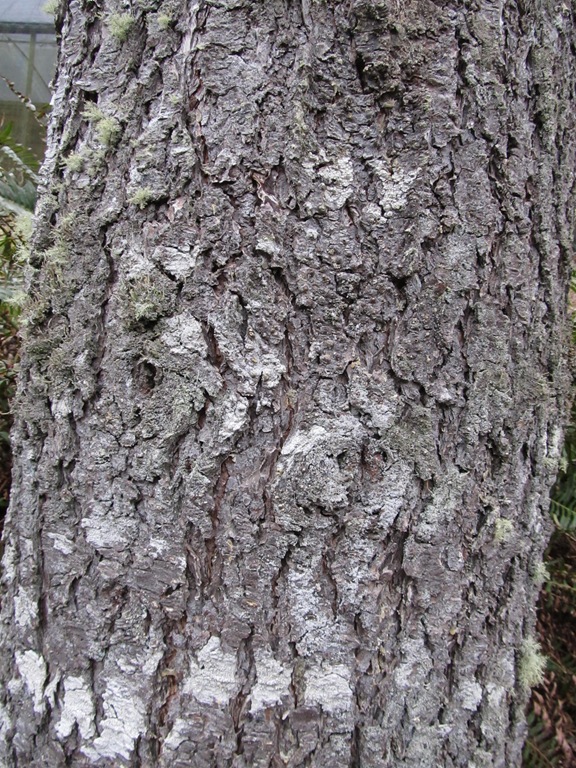When walking in an older growth forest, dense on the forest ground with vegetation, branches usually are not reachable to pull down a cone.  This bark to the left is what I was walking in.