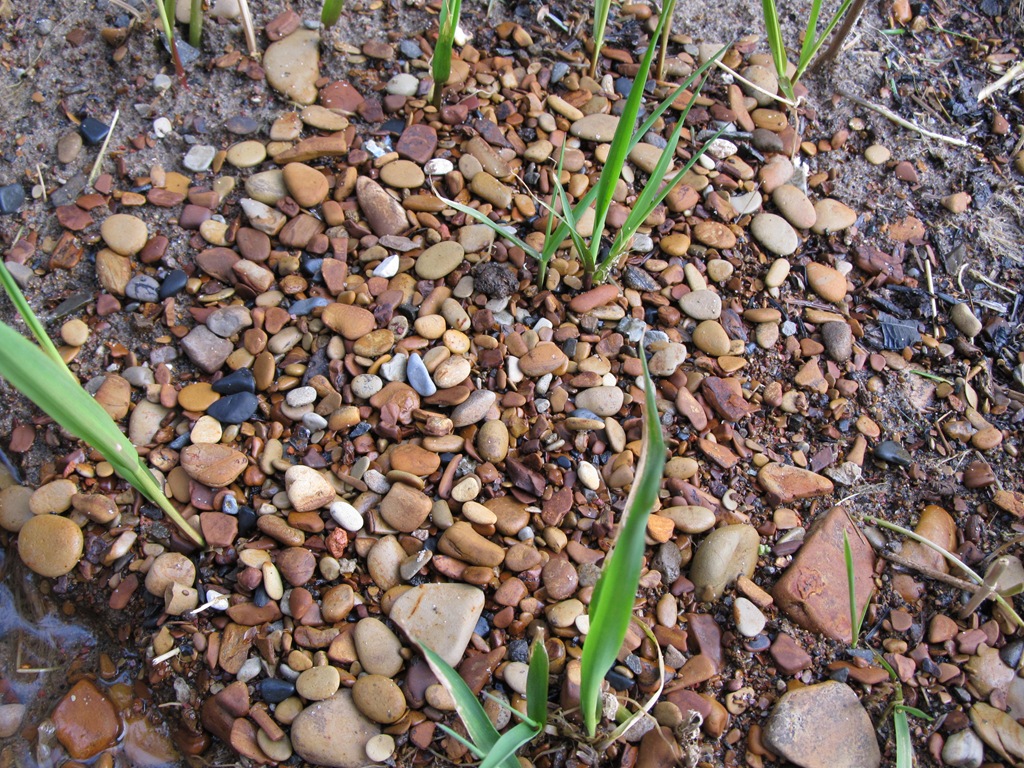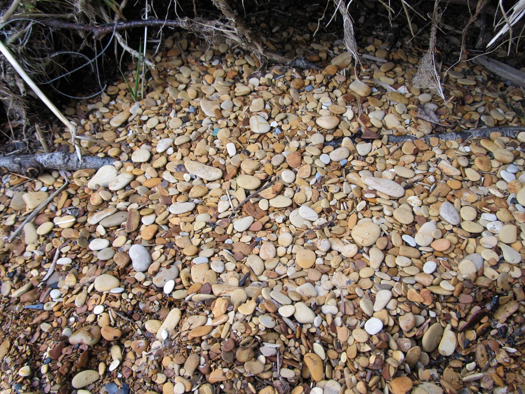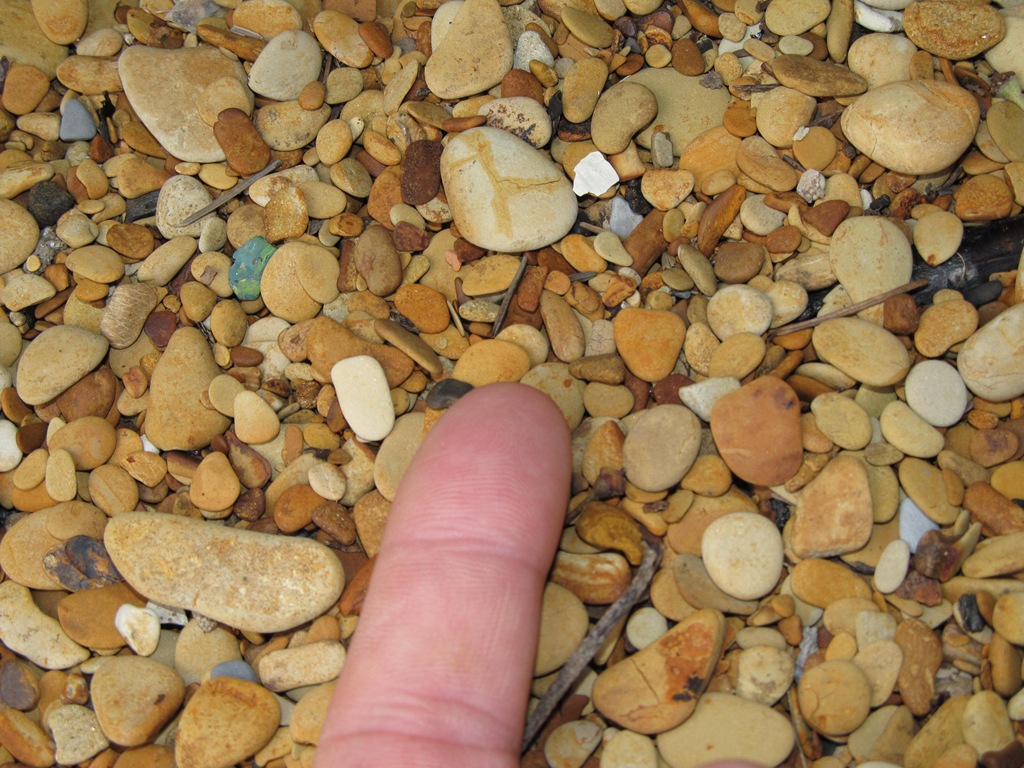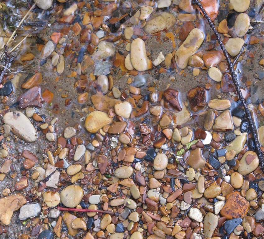 These are obviously the same little pebbles – in a rough state – however, they are in almost the same stream – or least the same type of stream, just a 1/4 mile away from the house. With the spring running full time – it has the water the same amount of time. And yet – they are not smooth. Rough. Round. Square. Thick. Hard. I am wondering why the pebbles at the lakes edge are so much smoother? Chemical make up of the lake water? Lake waves? Do these stones roll down to the mouth of the river and become smooth?