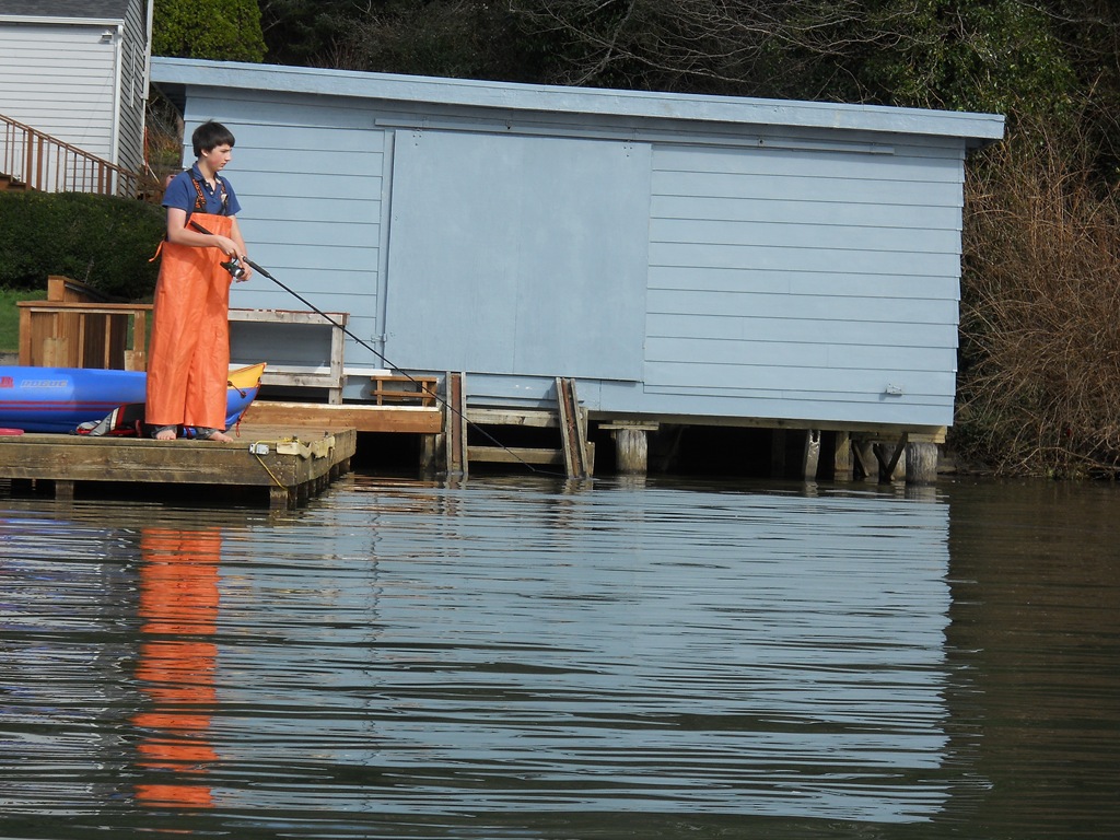 We like to put on the Water Proof gear to kayak in the winter. Nate dons Darren’s Grunden’s from way back in his Commercial Fishing Days. I wince a little, at my baby boy, my first born. Those bibs aren’t even pulled all the way up, and they are above his ankles. Nate says that there are quite a few tiny fish under the dock. We have heard that this particular area is a Bass Breeding Spot. Which was evidenced by the overabundance of fishermen last year. I think I’ll open a Hot Biscuit and Gravy stand on the dock this year.