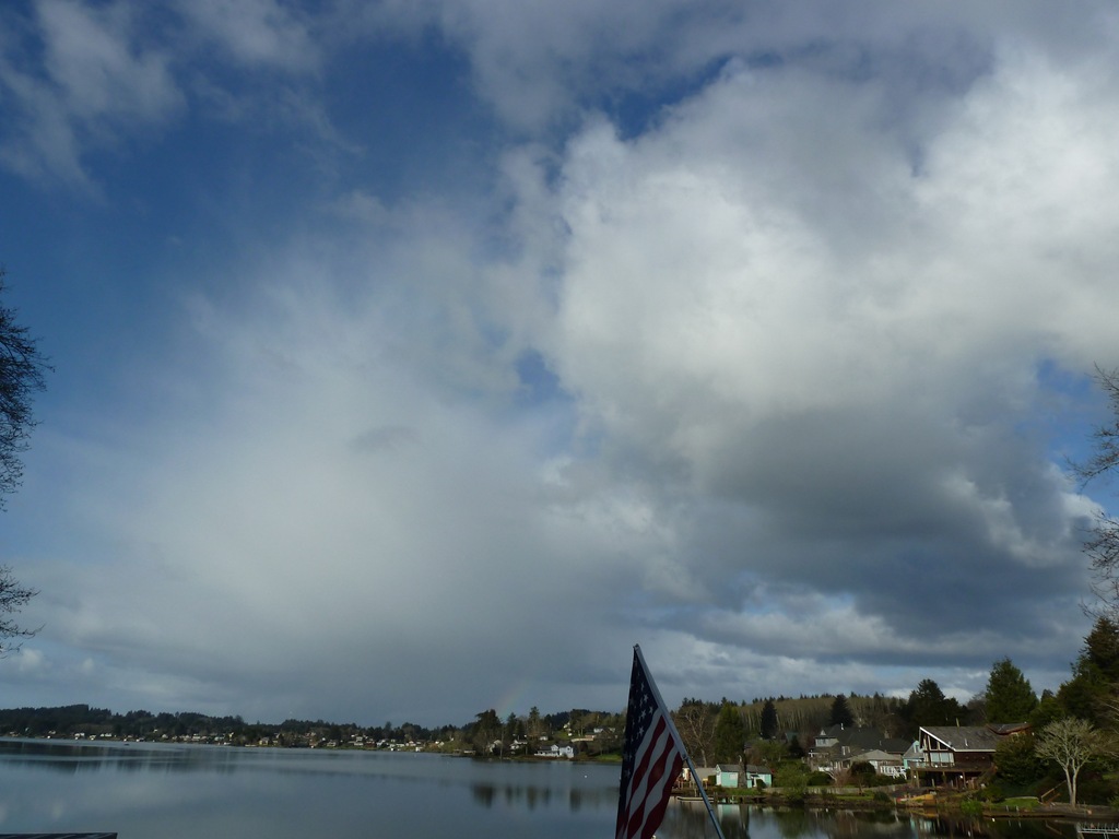 Fast forward to this week – Here is a pic of the sky on Tuesday. To the left of the flag is a rainbow, with a sky full of great cloud formations. Too lazy to stitch a panoramic view but – you get the picture. I think we have all been seeing this sky this week!