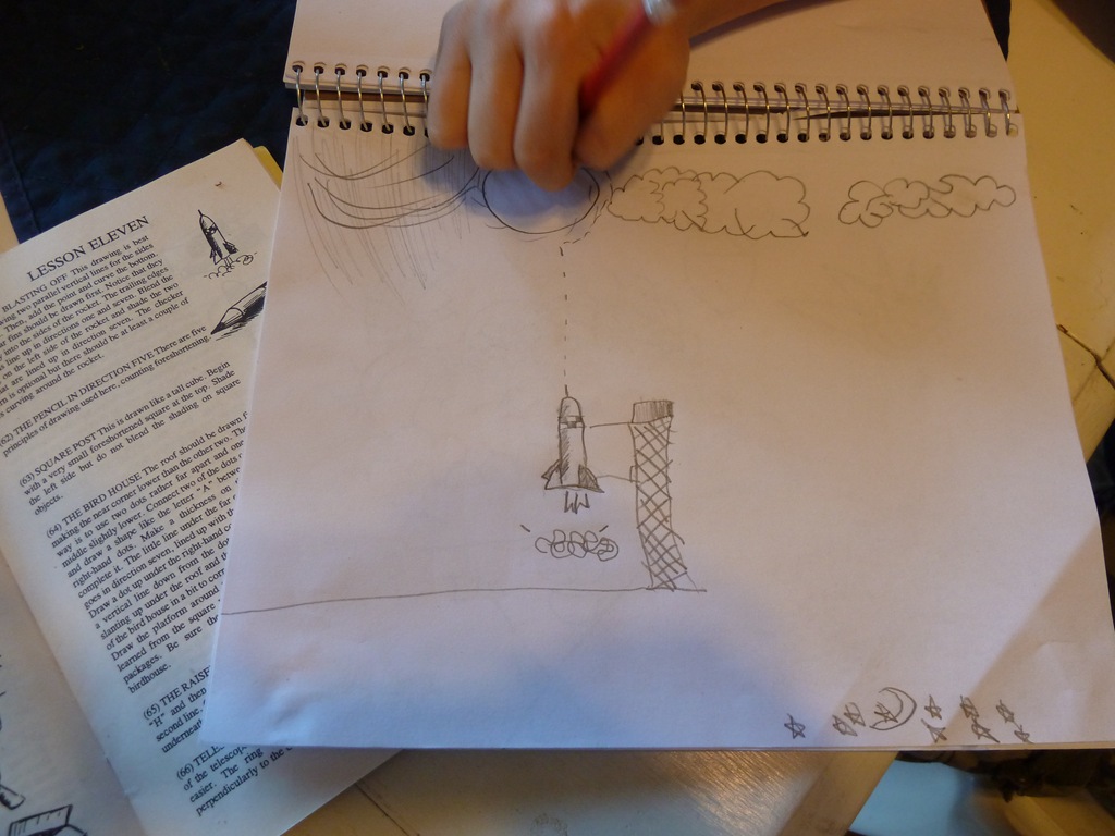 Jon started out with his Drawing Textbook – starting with a Rocket. I thought it was interesting that his Rocket is now sketched into a launching pad. And, he has the perception of going around the world from Sun to Moon. Maybe from a quote he read at the Museum from John Glenn,
