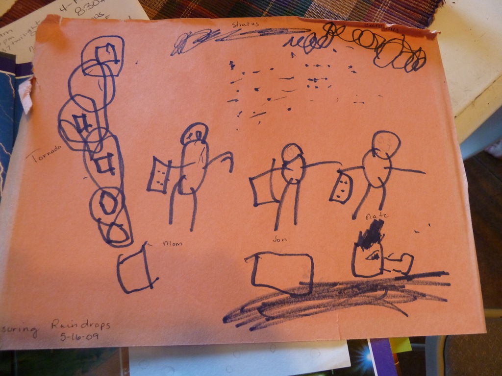 This last photo is for encouragement to the moms starting out – or the moms who don’t think their children “like” science or sketching or nature. When we were at the Aviation & Space Museum, the boys seemed to only like the games, yet Jon came home remembering the Jon Glenn quote and incorporated it into a drawing 6 days later. The above photo fell out of our favorite weather book. We were watching crazy cloud formations over the Central Oregon High Desert, and we were having Water Drops fall on Construction Paper so we could trace how big the water droplets were. Here is our little family with our water droplet page and the ever present Tornado, which he later said was the fence to the south of our property. See that date? 2 years ago. I had to look, think, and cross reference another project to make sure I didn’t mean 2008. Nope. Jon was cracking up at his People.