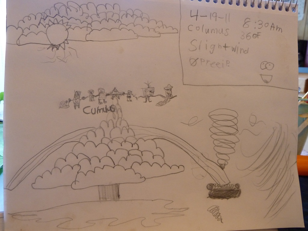 So we took out our favorite Weather Books, and filled out our Observations, After the rainbow, Jon’s interpretation was the following sketch: His notes – “That he found a new fun way to draw a heart, and it works for clouds as well, that he put a star on top of his “Tree”, and named him Sponge Bob, and he was lonely, so his friends came along, and wasn’t that a cool tornado we saw last week? And I wonder who’s house got the gold?”