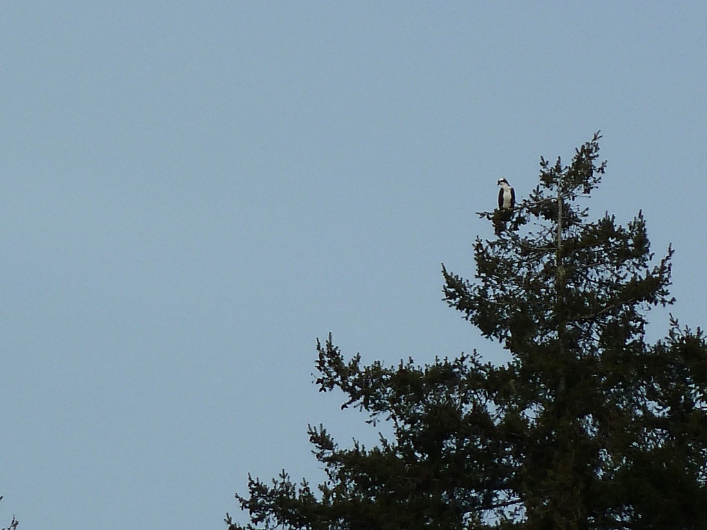 The Osprey sits in the Spruce tree – Watching the lake for trout. He swoops out of this tree – down the the lake – gliding first right in front of our windows.