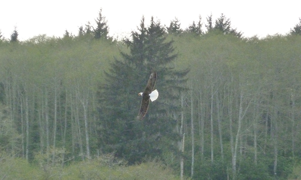 This went on for quite a while, they swooped right up on us, over us, and around us on our boat while we were fishing. Since then, we have seen it two more times. Enough to hear the pattern, and know to look for the Eagle now. I’m assuming it is going on every day – we just don’t see it. This seems to be their evening pre-dusk game. I was chatting on the phone one day this week when they swooped and had their game right in our yard.