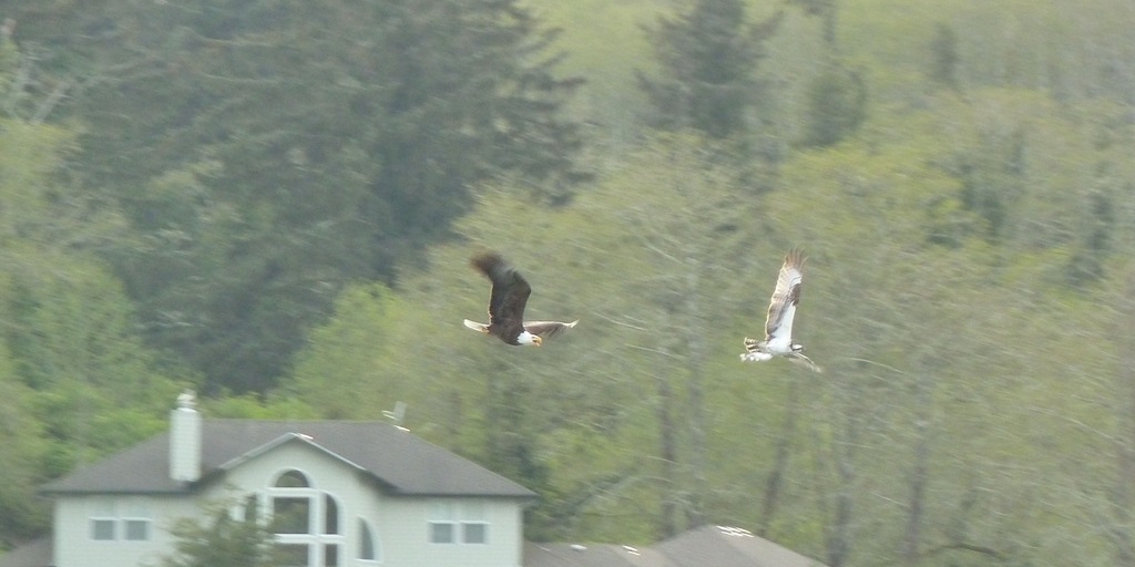 You can see the trout dangling from the talons of the Osprey, the Eagle is screamin’ now.