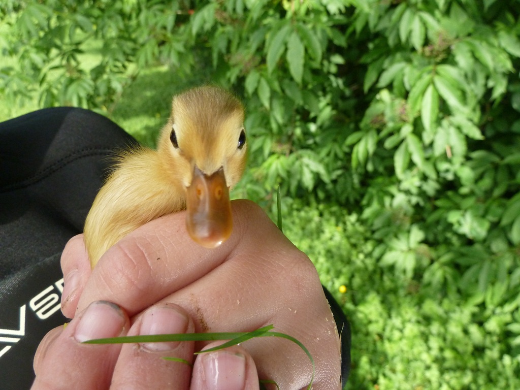 Proud Mama brought her ducklings around to show us yesterday – and stayed all afternoon! The boys and I were swimming for over two hours – and she just swam along with us – so much so – that scooping up a cute little critter was pretty effortless!