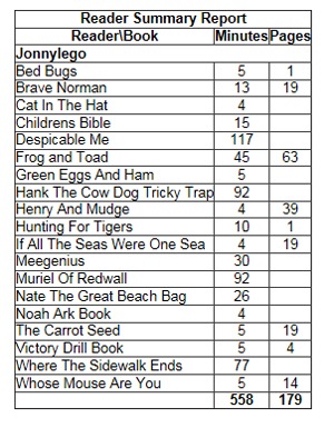 Here is the end result of about 15 days – I can email myself the reports, print them out, and the boys can fill out their forms. We are keeping track of Total Minutes, since the report prints this way, so if we print a report that had 236 minutes, draw a line, 430 minutes, draw a line, and this form, 558 minutes – draw a line and a date. They get a prize for every three hours that they read, so Jon will have 3 trinkets tonight. I think Nate, in the Teen Program gets a coupon for a drawing for every hour, so he’ll have quite a few for the box as well. (9 hrs)